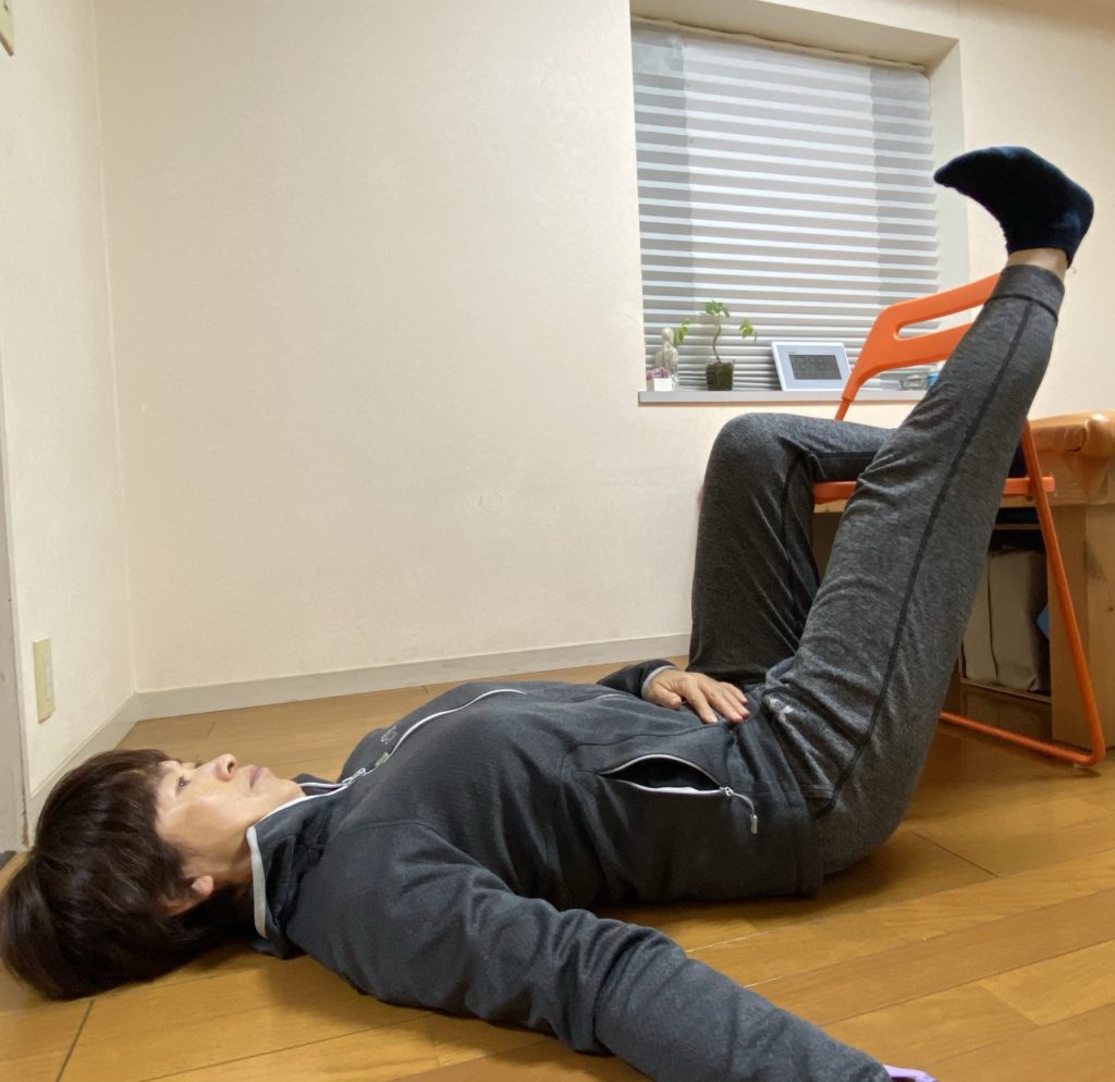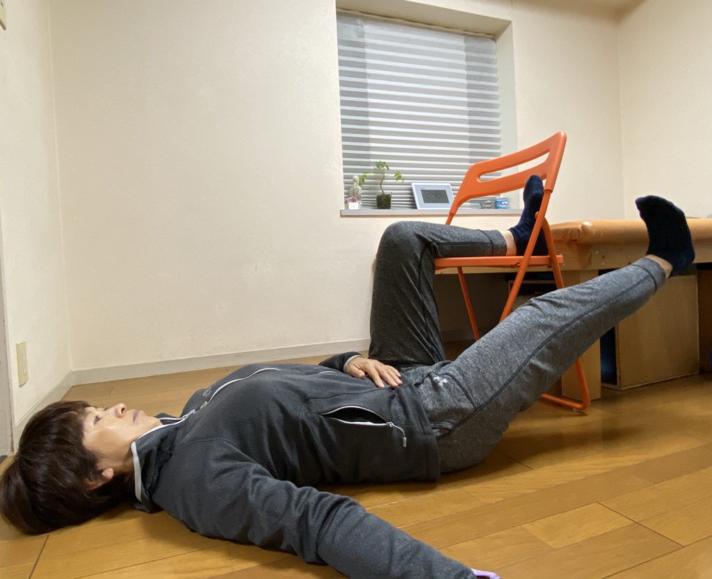 の状態で、腰が浮いている人は腰が床につくまでゆっくり大きく深い呼吸(この場合は腹式呼吸)をしていきます。